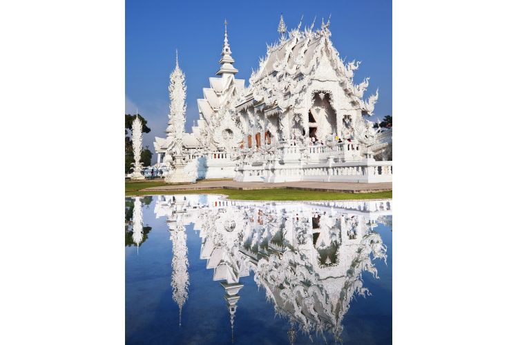【清莱白庙】它通体洁白如玉,看上去非常的圣洁,别具特色。建于1998年,由泰国著名建筑师(原为画家)ChalermchaiKositpipat设计建造,因他对佛祖的忠诚,还有对建筑设计的执着,造就了这么一个精细,完美的寺庙。这座寺庙为什么要为白色,他说:白色代表了纯洁,闪闪发光的玻璃片是智慧的象征。