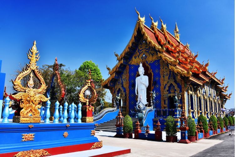 【清莱蓝庙】整座寺庙全部由天空与海洋中最令人陶醉的那种湛蓝色为基调,镶嵌上各种繁复华丽的金色花纹,更辅以紫、浅蓝、白、红等色点缀。白庙展现了单一颜色的纯净极致,而蓝庙体现了各种艳丽色彩汇聚一堂时的和谐。就连万寿菊和僧人们橘色的僧衣也在蓝色的衬托下,显得更加鲜艳。