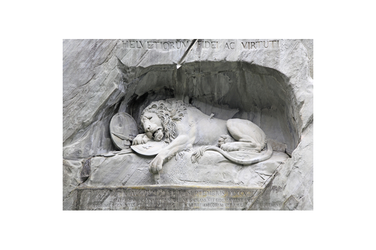 ●【狮子纪念碑】外观,为了纪念法国大革命时期为保卫路易十六而牺牲的瑞士雇佣兵,这头长10米、高3米多的雄狮,痛苦地倒在地上,折断的长矛插在肩头,美国作家马克•吐温将“濒死的琉森狮子”誉为“世界上悲壮和感人的雕像”。