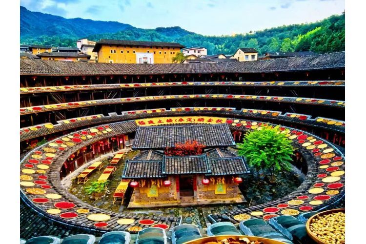 早餐前往【初溪土楼群】(游览时间约2H,不含电瓶车10元)位于福建省永定区下洋镇初溪村,自明代至现代,历经数百年建成,为徐氏家族聚居地,总面积为14.72公顷。初溪土楼群是永定区内最原始、最具客家人文色彩的土楼,被誉为“中国最美丽的土楼群”。初溪土楼群是永定“三群两楼”中的一群,由五座圆楼和数十座方楼(主要有集庆楼、余庆楼、绳庆楼、华庆楼、庚庆楼、锡庆楼、福庆楼、共庆楼、藩庆楼、善庆楼等)组成,主要种类有长方形、正方形、圆形、六角形等。初溪土楼群的楼名中间都带有一个“庆”字,以示人丁兴旺、万事如意。初溪土楼群独特的建筑风格和古老的韵味体现出较高的美学和历史价值,显示了中国劳动人民的智慧和创造才能。初溪土楼群建筑规模和建筑艺术营造的文化氛围为世界各地少见,展示了中原遗风和客家民风。