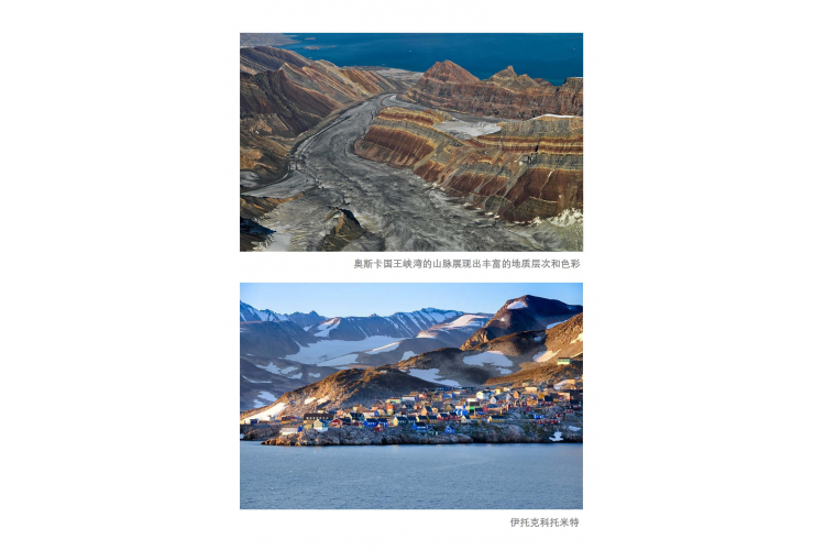 进⼊奥斯卡国王峡湾,您会看到雄伟的⼭脉展现出丰富的 地质层次和⾊彩。由于不同矿物质的作⽤,岩层呈现出红 ⾊、橙⾊、⻩⾊、绿⾊等多种⾊调,仿佛置⾝于⽕星表⾯, 是格陵兰东部最令⼈叹为观⽌的地质奇观之⼀。在峡湾中 航⾏或乘坐冲锋艇巡游时,您会惊叹于两侧陡峭的五彩⼭ 峰与漂浮的形态各异的冰⼭,宛如⼤⾃然的杰作雕塑。 峡湾沿岸或⼭坡上,有时可以看到驯⿅和麝⽜在悠闲觅⻝, 这⾥还是北极⻦类的栖息地,如雪鸮、燕鸥和雪鹱等。探 索这⽚峡湾的最佳⽅式是乘坐冲锋艇或⽪划艇,如果天⽓ 允许,徒步穿越七⾊⼭脉将带来全景式的壮丽峡湾⻛光, 让您真正领略北极荒野的原始美景。