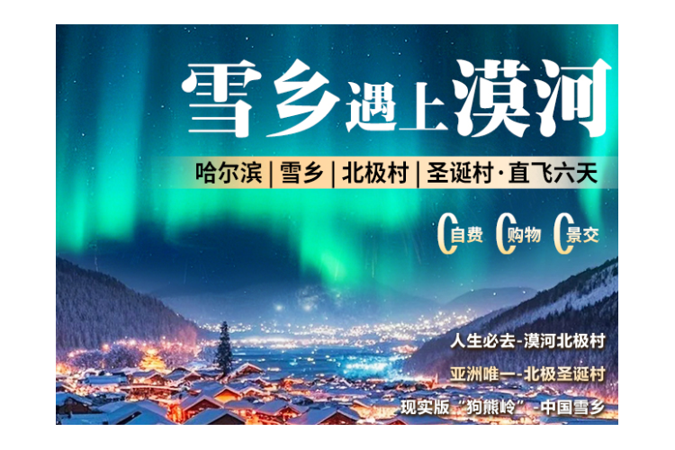 【雪乡遇上漠河】东北哈尔滨双飞6天∣0自费0购物∣不夜城漠河∣北极村∣圣诞村∣漠河舞厅∣“狗熊岭”中国雪乡∣福地松苑∣北极星公园∣冰城哈尔滨∣中华巴洛克∣音乐公园大雪人(南航哈哈往返)