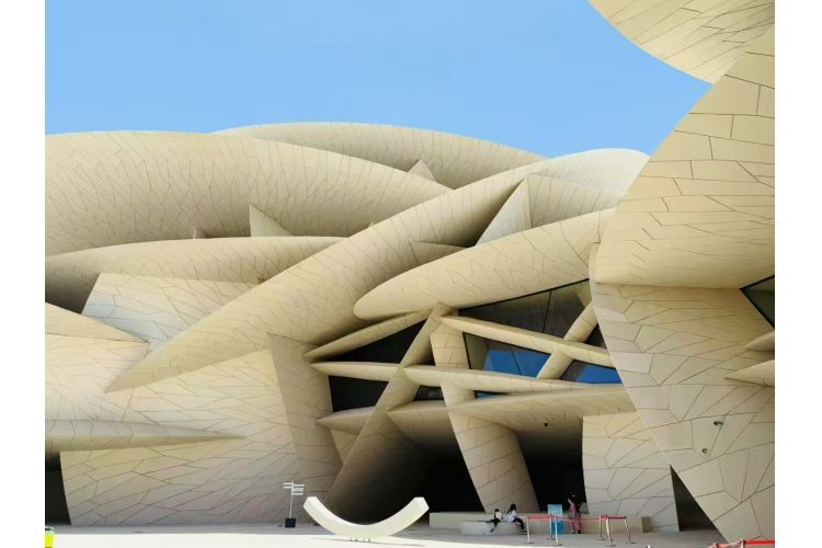 参观【卡塔尔国家博物馆】(约90分钟)(入内参观,周二闭馆),该馆外形仿造“沙漠玫瑰”这一自然现象(沙漠中神奇的凝固和结晶现象,如刀片般‘花瓣’互相交叉的形状)。由一系列的变化着曲率和尺寸的联锁圆盘组成,它们形成了建筑的墙、地板、顶棚和阳台,由法国著名设计师普金·努维尔设计;