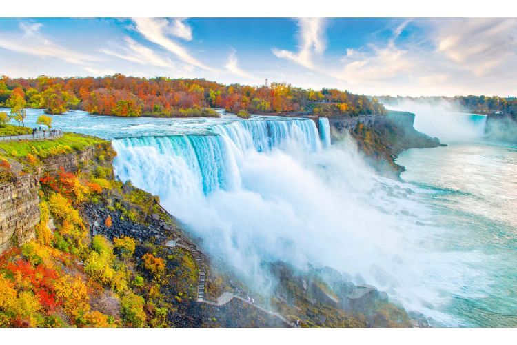 早餐后乘车前往【布法罗】游览世界上最壮观的【尼亚加拉大瀑布】(不低于45分钟):瀑布位于美加两国交界处五大湖区,其中一侧在美国, 另一侧在加拿大,高达56米,岸长约675米。马蹄瀑布丰沛浩瀚的水量从50多米的高处直冲而下,发出震耳欲聋的轰鸣,气势有如雷霆万钧。瀑布溅起的浪花和水气,有时高达100多米,当阳光灿烂时,便会营造出一座七色彩虹。在美国境内的美国瀑布又称为婚纱瀑布,因其极为宽广细致,很像一层新娘的婚纱,因而得名。