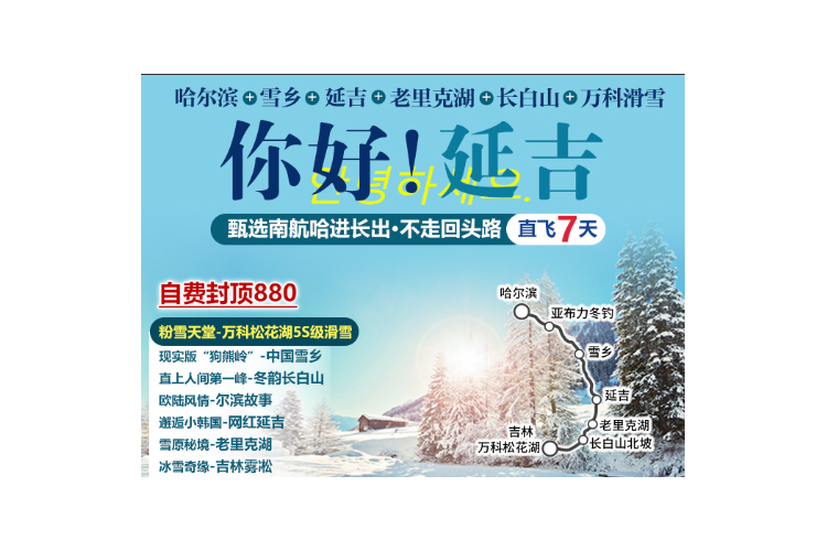 寒假春节【您好!延吉】东北双飞7天∣冰城哈尔滨∣现实版“狗熊岭”·中国雪乡∣小韩国延吉∣老里克湖∣长白山天池∣万科松花湖5S级滑雪∣奢享长白温泉∣吉林雾凇∣东北大秧歌∣花车巡游∣朝鲜民俗村(南航哈进长出)