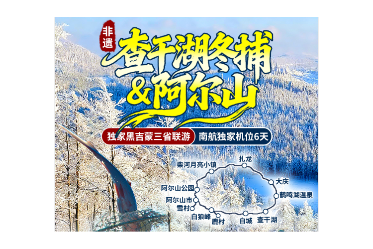 寒假【非遗查干湖+阿尔山】东北双飞6天∣一价全含∣独家三省联游(黑龙江/内蒙古/吉林)|查干湖冬捕∣阿尔山天池∣越野车登顶白狼峰∣白狼镇·鹿村∣百里雾凇长廊∣童话阿尔山雪村∣扎龙丹顶鹤∣鹤鸣湖温泉度假区∣雪地云鹤温泉(南航大庆往返·含税)