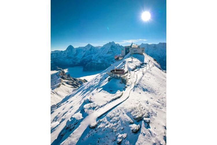 早餐后,乘车前往雪朗峰(Schilthorn)*(含往返缆车门票),位于瑞士伯尔尼山中,海拔 2970 米,是该山脉北部最高峰。雪朗峰山顶设有宽敞的观景平台,在这里可欣赏到 360 度无与伦比的美丽全景,能看到包括艾格峰、僧侣峰和少女峰在内的 200 多座雄伟山峰,这些被联合国教科文组织列为世界自然遗产的山峰雄伟壮丽,山脚下则是波光粼粼的图恩湖。 雪朗峰因 007 系列电影《女王密令》和《铁金刚勇破雪山堡》在此拍摄而闻名。山顶的旋转餐厅 Piz Gloria 曾是电影中反派布洛菲尔德的总部,餐厅外有 007 星光大道,设有 15 个信息板,通过照片、签名和钢制手印向电影制作团队致敬。山顶中心一层还有 “007 邦德大世界” 互动展览,展示影片中的七个重要场景。独特的旋转餐厅Piz Gloria 是世界上第一个建在山顶的旋转餐厅,可容纳 420 名客人,每 45 分钟旋转一周,游客在用餐的同时能尽揽群峰美景,且每转一段都会有图示清晰的铁牌介绍所面对的山峰及海拔。