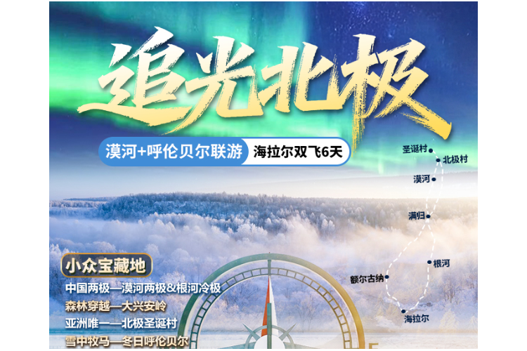 3月【追光北极】内蒙海拉尔双飞6天∣0自费0购物∣极北漠河∣北极村∣圣诞村∣最北人家∣漠河舞厅∣中国冷极根河∣敖鲁古雅使鹿部落∣不冻河雾凇∣冰雪白桦林∣呼伦贝尔大雪原∣满归大门∣纯玩0自费∣2+1陆地头等舱
