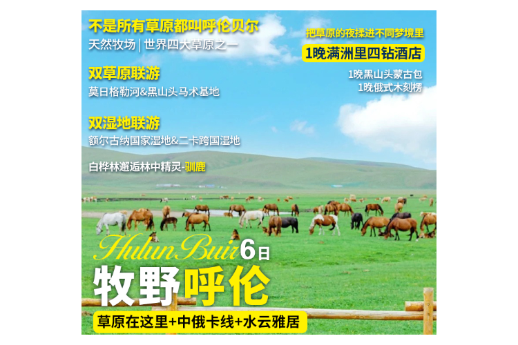 ★特色住宿:1晚满洲里四钻+2晚三钻酒店+1晚黑山头蒙古包+1晚俄式木刻楞,把草原的夜揉进不同梦境里!