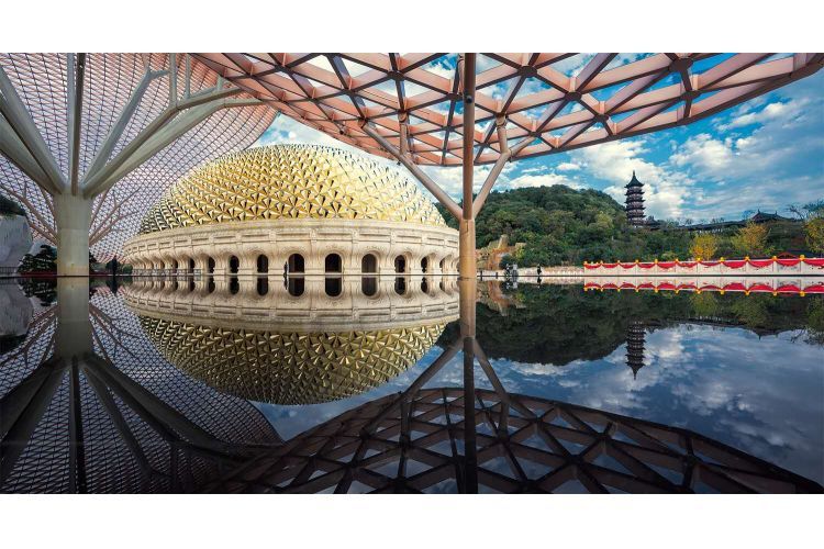 1、佛顶宫水池倒影(网红 C 位):低角度拍摄,人物站水边拍对称倒影,可同时框入佛顶宫 “大榴莲” 与佛顶塔;