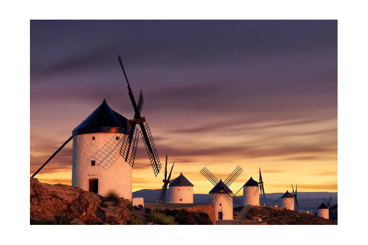 【孔苏埃格拉】(游览约 1 小时),这里是塞万提斯笔下《唐吉诃德》中唐吉诃德大战风车的故事发生地,小镇拥有 12 座白色风车,矗立在风景如画的山丘上,每座风车都有独特的名字和历史意义,风车不仅是当地传统农耕文化的象征,还展示了 16 世纪西班牙的技术成就。