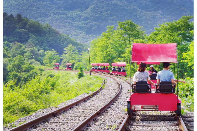 【江村铁路自行车】(参观约90分钟),韩国著名综艺节目《RunningMan》拍摄点,人气体验,乘坐于铁轨上用脚踏板行驶的自行车,可轻松地游览青山、绿野与江流交织出的田园风光。